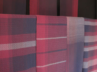 I've now woven a few scarves with lovely silk in three colours: navy, magenta and mauve. They combine with the navy, purple and burgundy warp really nicely. I'm looking forward to seeing how they work when fringed, washed, pressed and ready to wear.